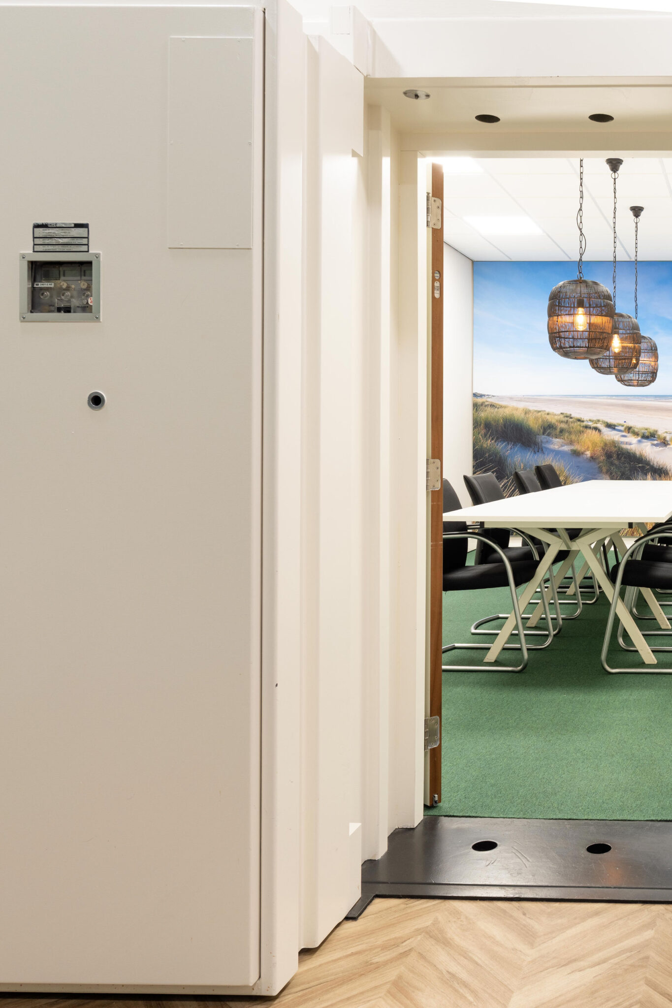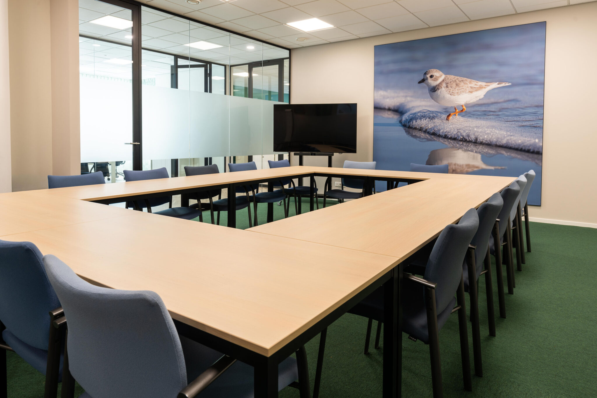 De centrale hal vormt het kloppend hart van de organisatie. Hier kozen we voor warme materialen, comfortabele stoelen en een grote stamtafel die uitnodigt tot ontmoeting. Het karpet, speciaal ontworpen voor dit project, is geïnspireerd op het nieuwe logo en de kleuren van de huisstijl. Groene accenten en natuurlijke beplanting brengen rust en frisheid in het interieur – een subtiele verwijzing naar de duinen van Rockanje.