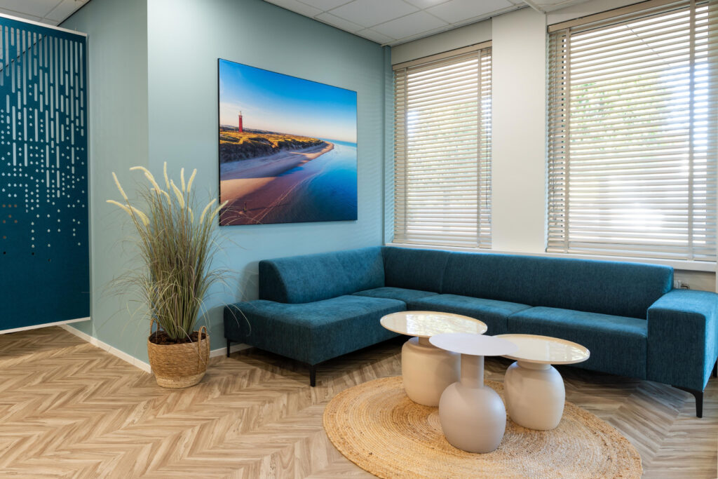 De gele muren maakten plaats voor zachtere tinten. De bestaande groene wanden en het tapijt sloten mooi aan bij de nieuwe huisstijl. In de frames kwamen nieuwe doeken, met beelden van Voorne Putten en Goeree Overflakkee. Herkenbare gebouwen, strand en natuur vormen samen een ode aan de regio waar Delta Dokters geworteld is.