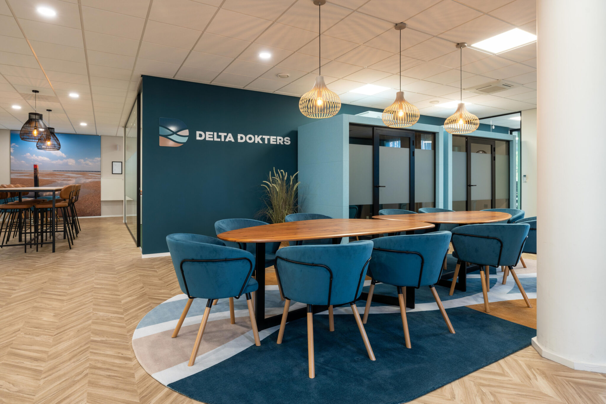 Het eindresultaat is een sfeervol en herkenbaar interieur dat de fusie tastbaar maakt. Met natuurlijke materialen, frisse blauw groene tinten en bestickering met het Delta Dokters logo bij de entree straalt het pand rust, verbondenheid en professionaliteit uit.